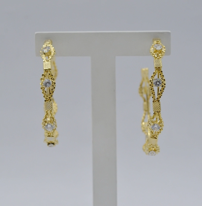 Descrição: Brinco arcgola poonto de luz, cravejado com zircônia, disponível em banho de Ouro 18k.