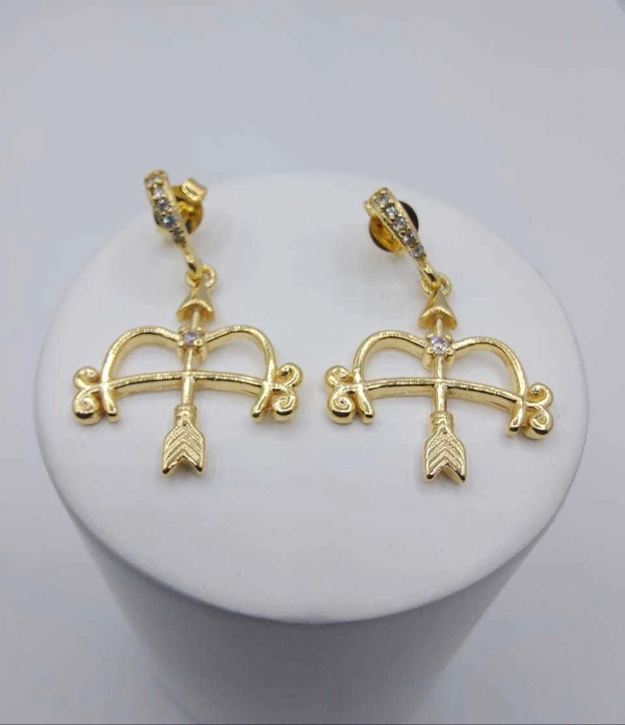 Descrição: Brinco ofá de Oxóssi cavejado com microzircônia. Disponível em banho de Ouro 18k ou Prata 925.