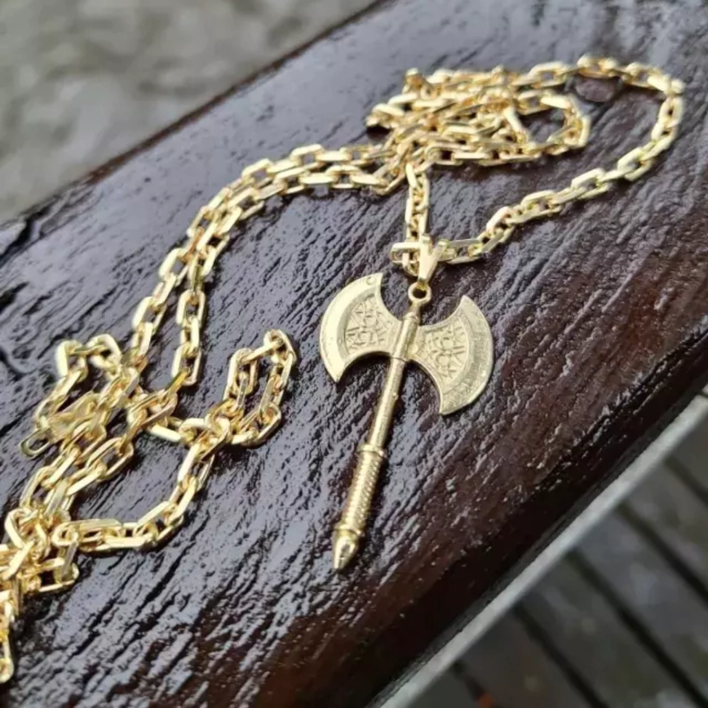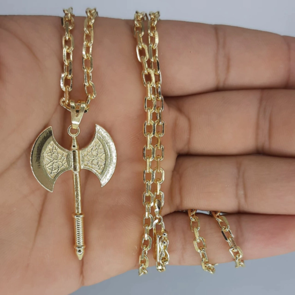 Descrição: Conjunto Pingente Oxê de Xangô + Corrente Cadeado 70cm 15gramas c/ fecho canhão. Disponivel em banho de Ouro 18k