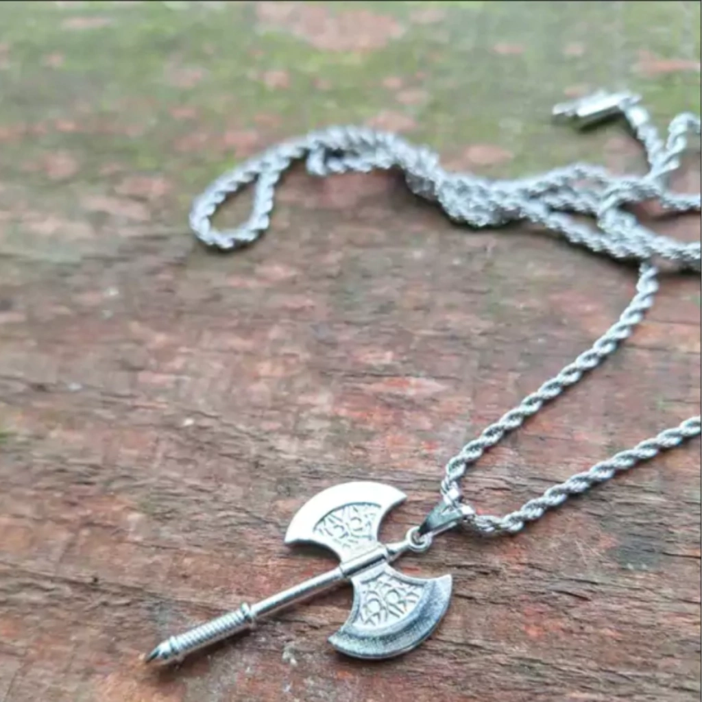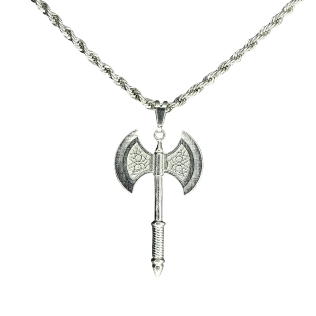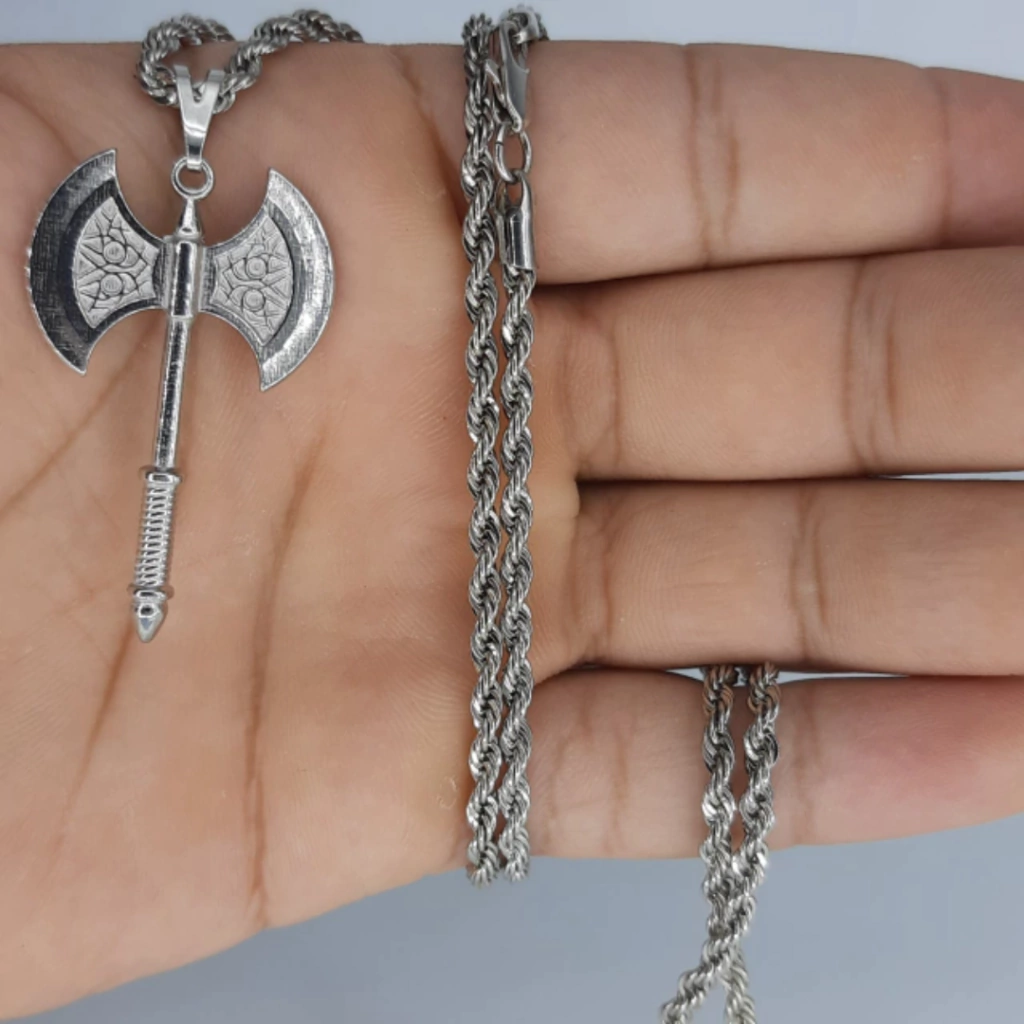 Descrição: Conjunto Pingente Oxê de Xangô + Corrente Cordão Baiano de 65cm ou 70cm, em banho de Prata.