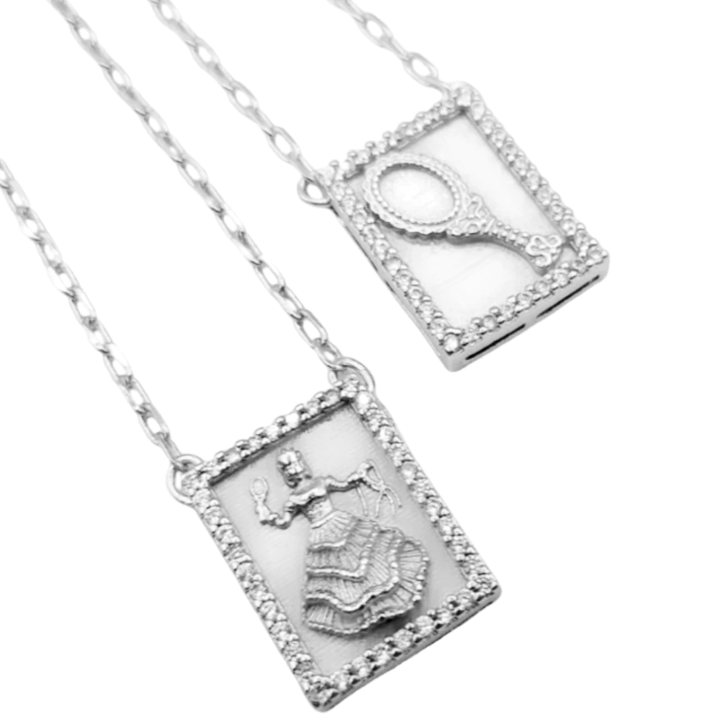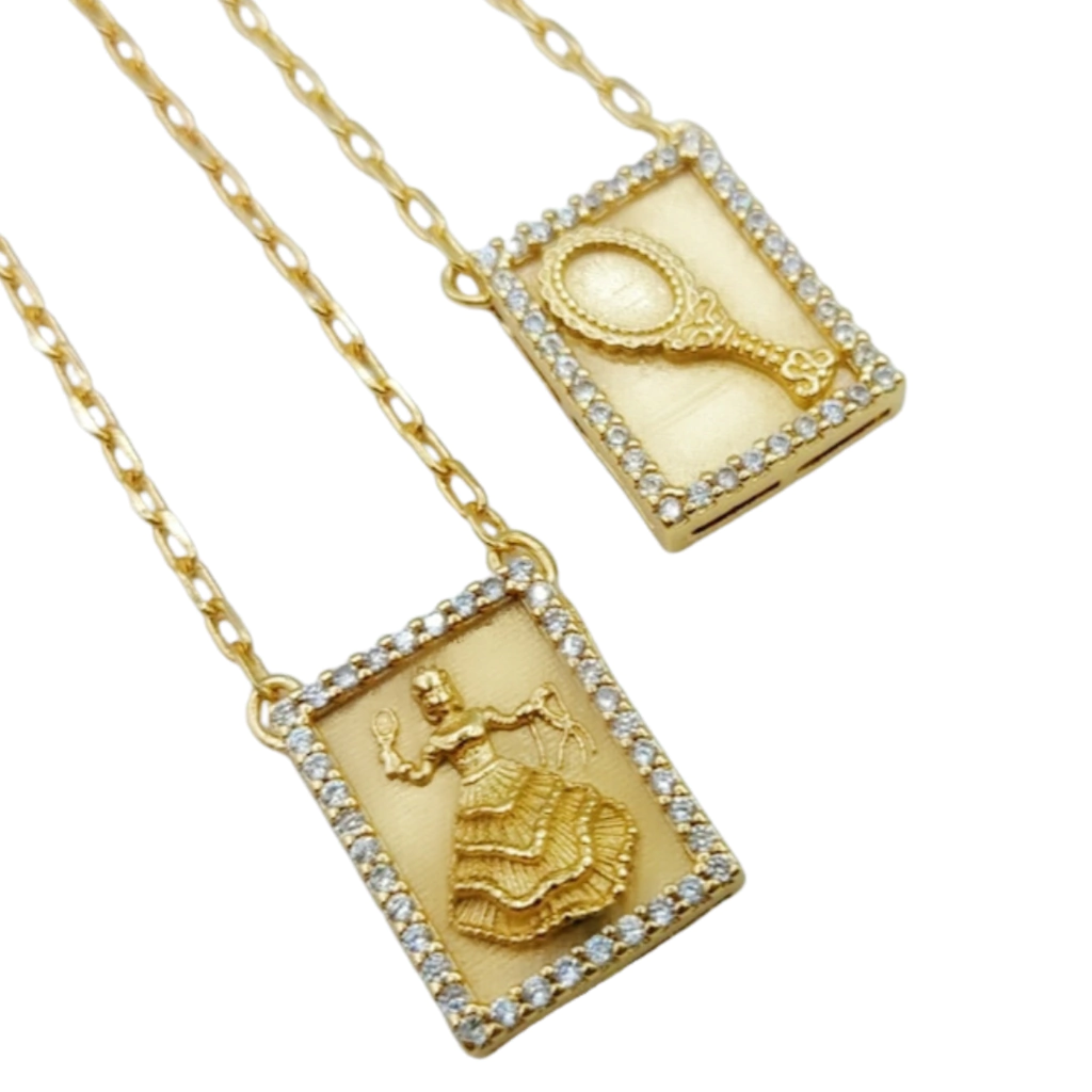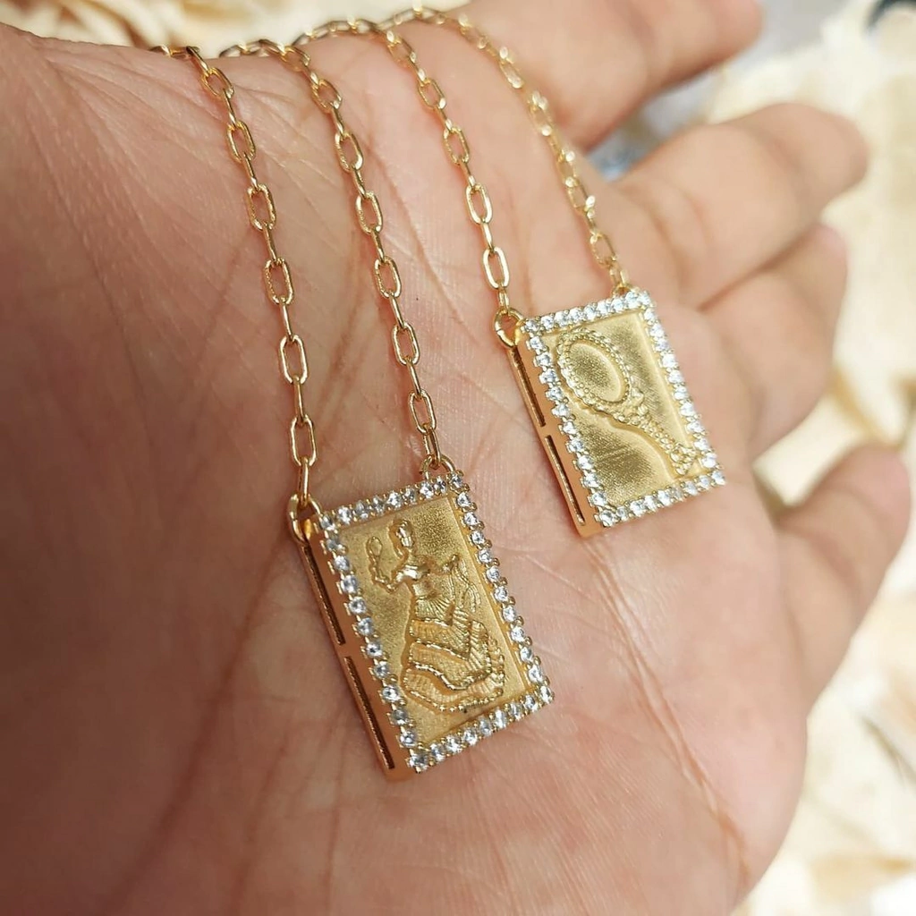 Descrição: Escapulário Placa Orixá Oxum cravejado com mircro zircônias na cor cristal. Disponivel em banho de Ouro 18k.