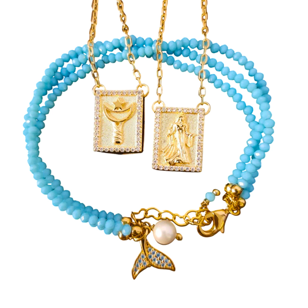 Descrição: Kit Iemanjá - Escapulário Iemanjá estilo caixa cravejado com micro zircônias na cor cristal + Pulseira Iemanjá três linhas, na cor azul com pingente de Cauda. Disponível em banho de Ouro 18k.
