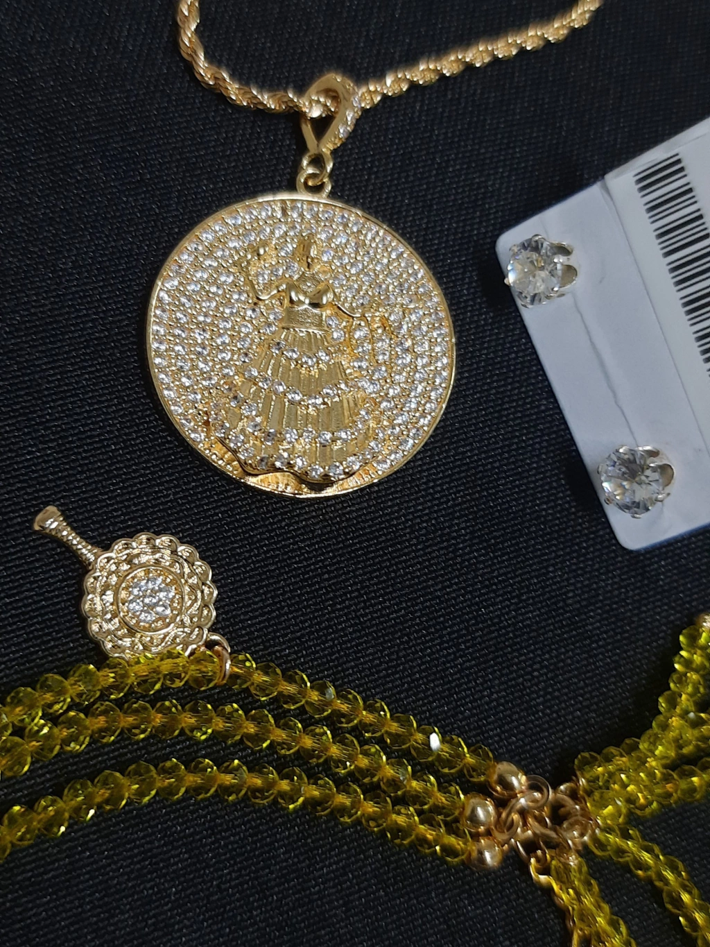 Descrição do Kit: Contem um Pingente Mandala média de Oxum cravejada com micro zircônia na cor Cristal, Corrente Cordão Baiano de 40/45cm com extensor e Pulseira 3 linhas com pingente de Oxum e zircônia. Disponível em banho de Ouro 18k. Brinco de Zircônia cristal incluso de brinde!