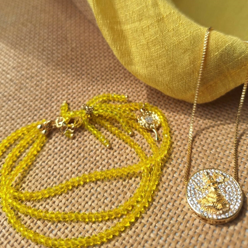 Descrição do Kit: Contem um Pingente Mandala pequena de Oxum cravejada com micro zircônia na cor Cristal, Corrente Veneziana de 40/45cm com extensor e Pulseira 3 linhas com pingente de Oxum e zircônia. Disponível em banho de Ouro 18k. Brinco de Zircônia cristal incluso de brinde!