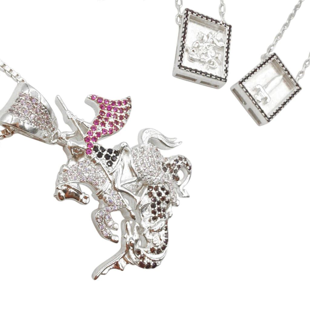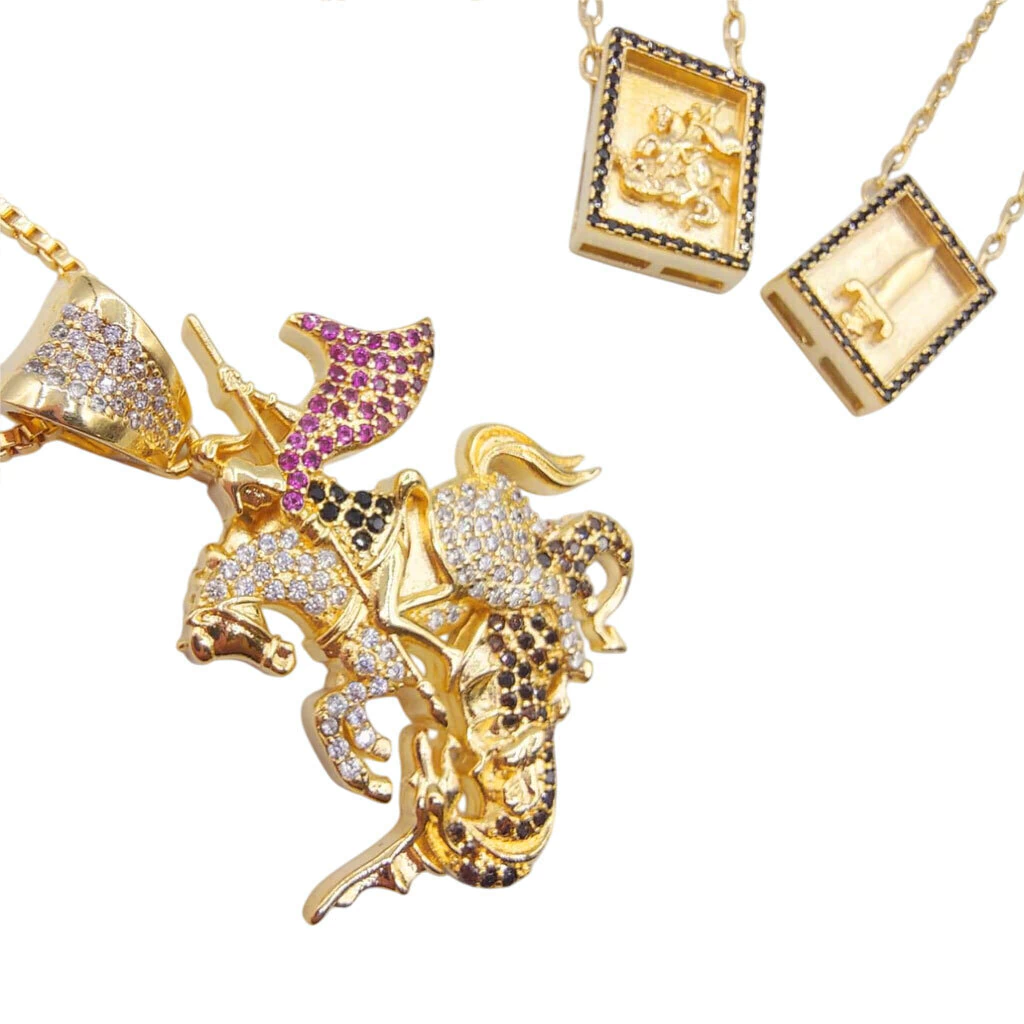Descrição: Pingnte são jorge cravejado com zircônias + Escapulário de são jorge c/ zircônias. Disponível em banho de Ouro 18k.