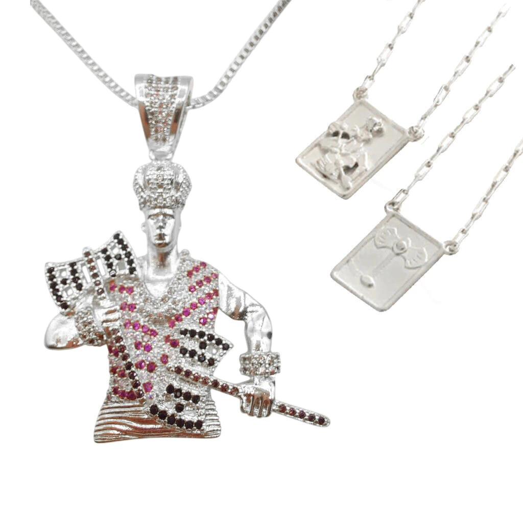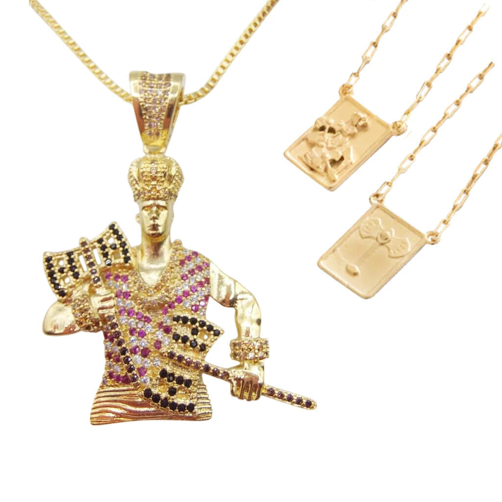 Descrição: Kit Xangô: Pingnte cravejado de Xangô + Corrente veneziana 45cm + Escapulário placa de Xangô. Disponível em banho de Ouro 18k e Prata 925.