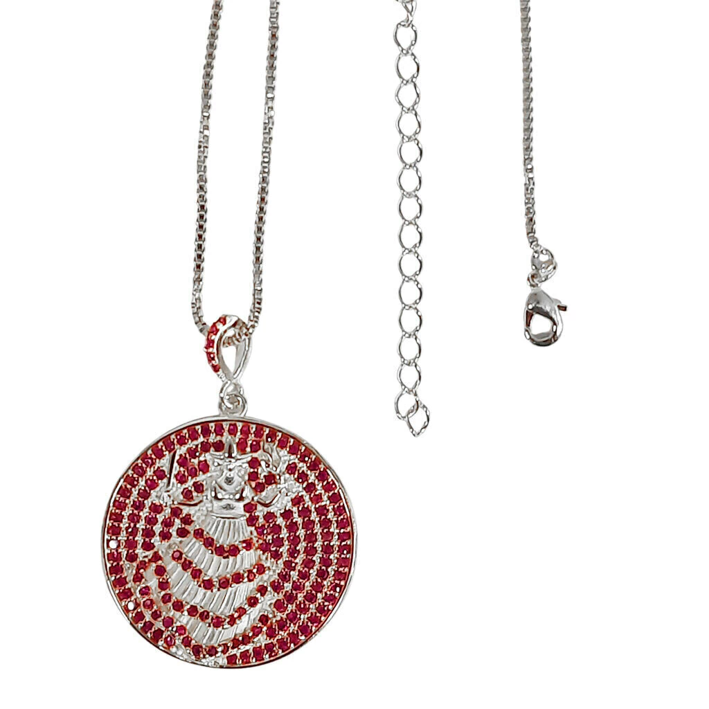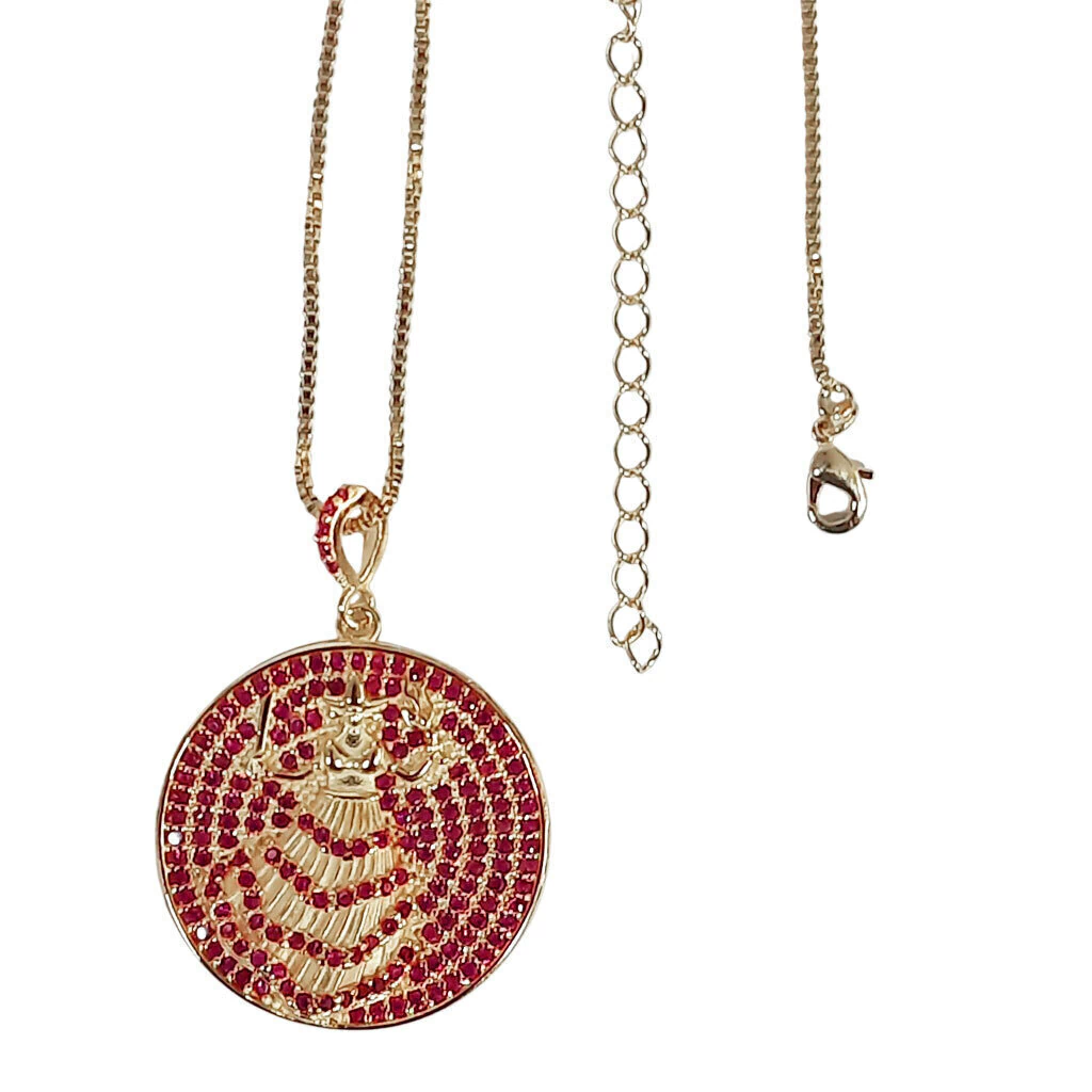 Descrição: Pingente Mandala Média Orixá Iansã cravejada com micro zircônias rubi + Corrente veneziana de 40/45cm com extensor. Disponível em banho de Ouro 18k e Prata 925.