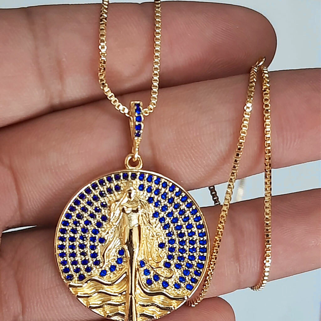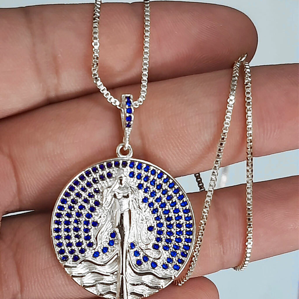 Descrição: Pingente Mandala Média Orixá Iemanjá cravejada com micro zircônias safira + Corrente veneziana de 40/45cm com extensor. Disponível em banho de Ouro 18k e Prata 925.