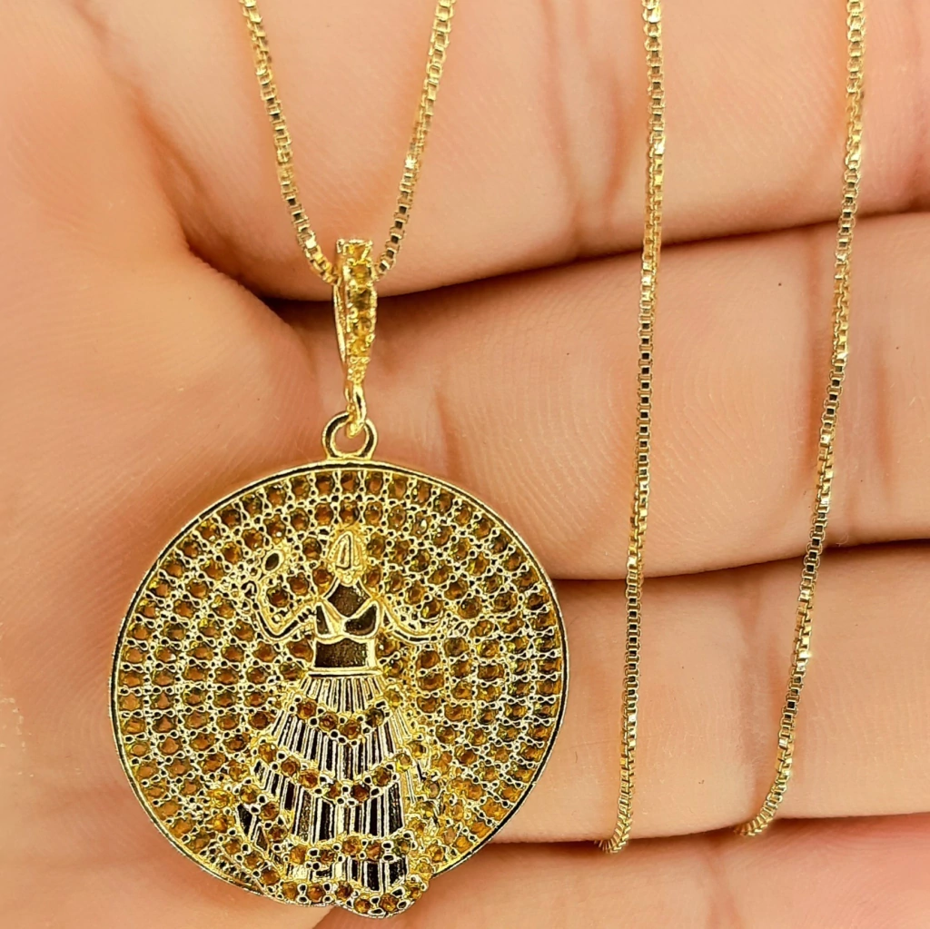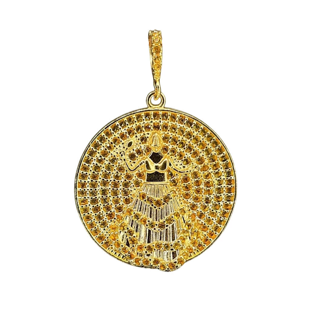 Descrição: Pingente Mandala Média Orixá Oxum cravejada com micro zircônias amarelas + Corrente veneziana de 40/45cm com extensor. Disponível em banho de Ouro 18k.