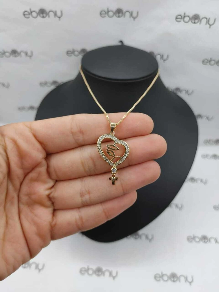 Descrição: Pingente coração de nossa senhora, cravejado com micro zircônias n tom cristal. Disponível em banho de Ouro 18k.