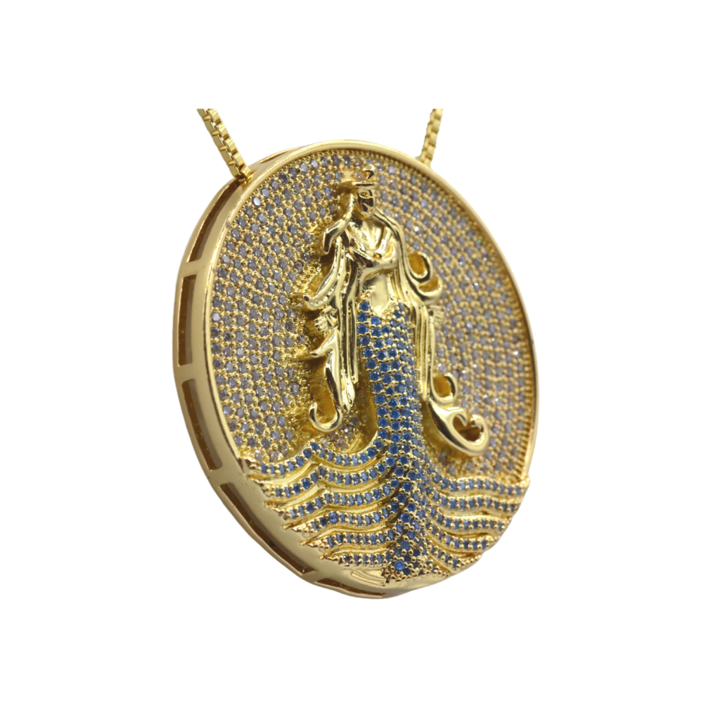 Descrição: Pingente Mandala Grande Iemanjá cravejada com micro zircônias nas cores cristal e azul + Corrente veneziana de 60cm. Disponível em banho de Ouro 18k.