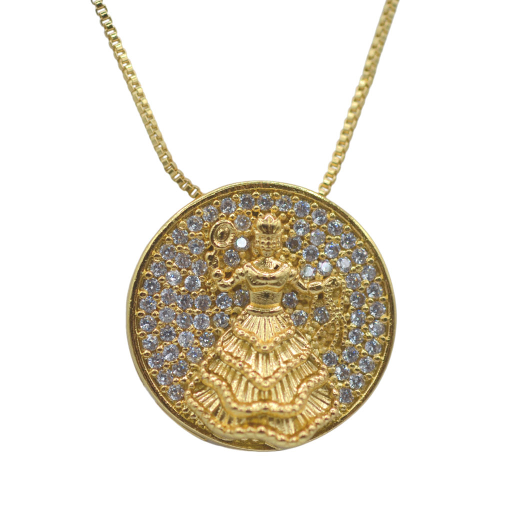 Descrição: Mini mandala de Oxum cravejada com micro zircônias cristais + Corrente veneziana de 40cm com extensor. Disponível em banho de Ouro 18k ou Prata 925.