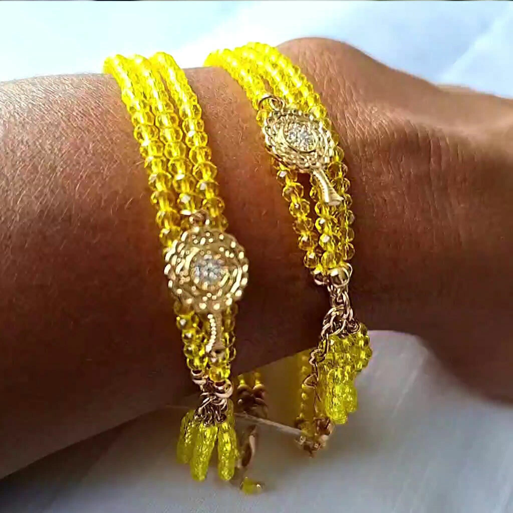 Descrição: Pulseira Cristais Amarela De Oxum, Com Pingente Abebe De Oxum Cravejado Com Micro Zircônias, Disponível Em Banho De Ouro 18k.