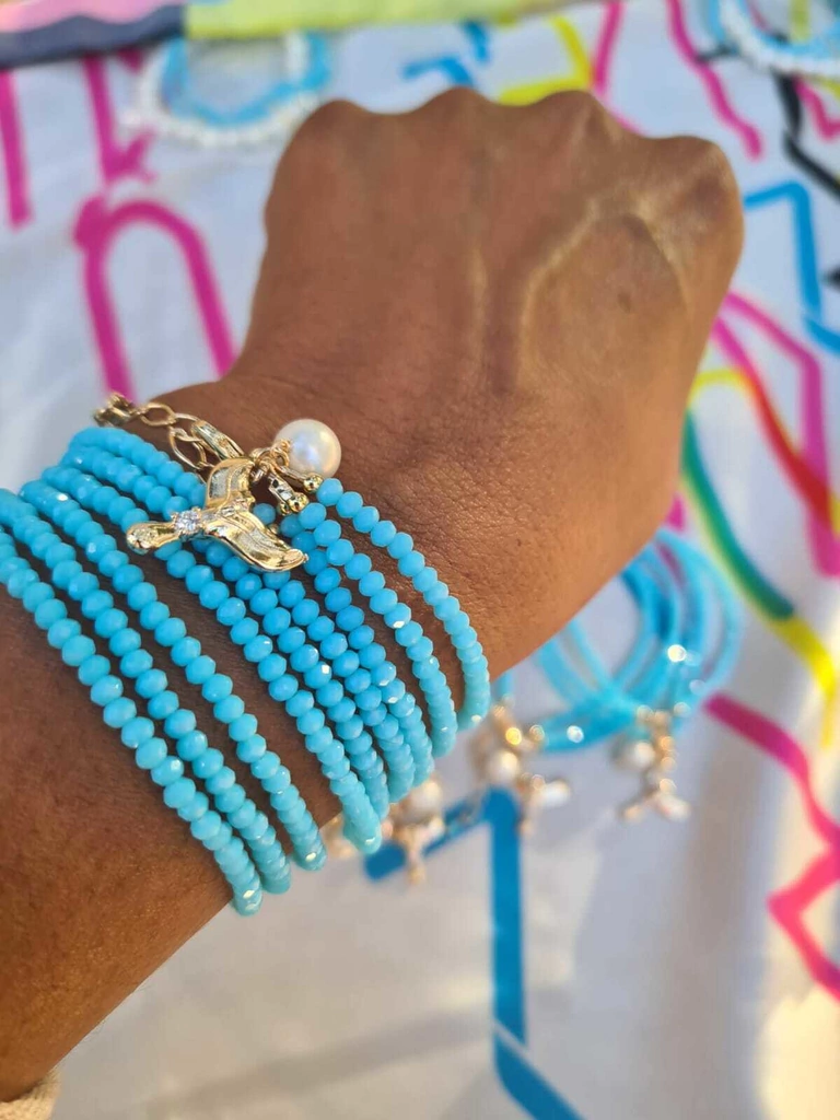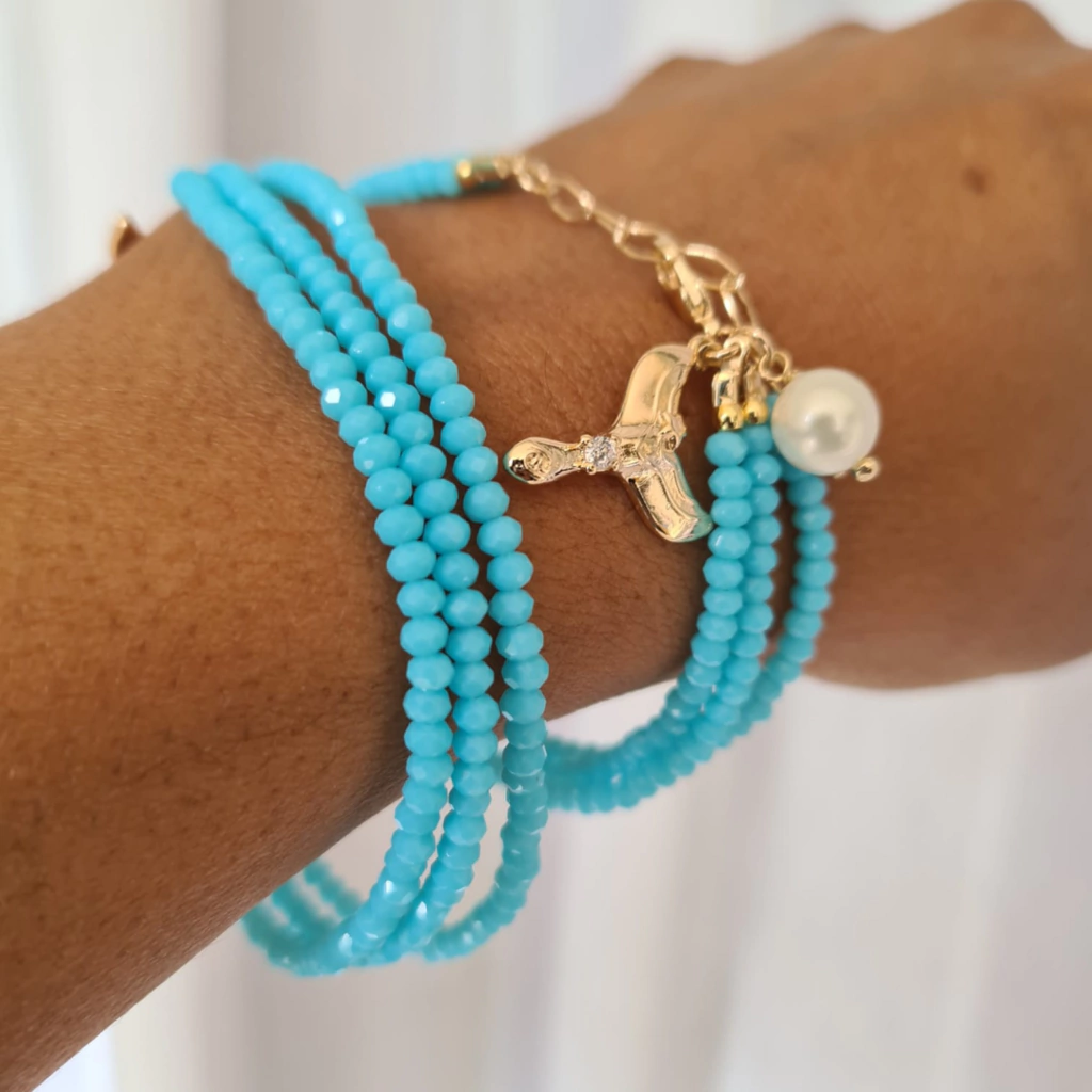 Descrição: Pulseira Três Linhas De Cristais Na Cor Azul, Com Pingente Iemanjá Cravejado Com Micro Zircônias, Disponível Em Banho De Ouro 18k.