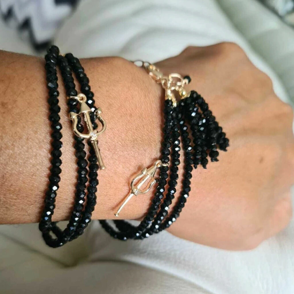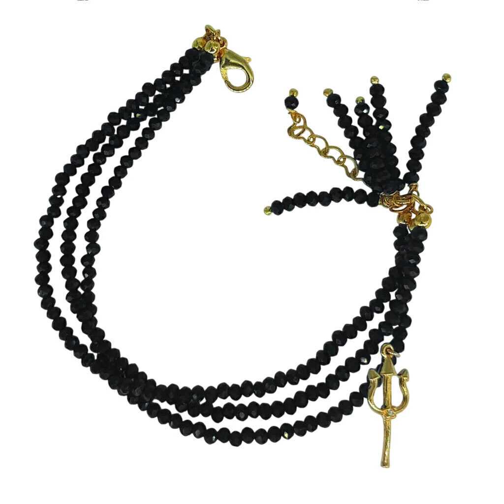 descrição: Pulseira Três Linhas De Cristais Na Cor Preta, Com Pingente Pombagira Cravejado Com Micro Zircônias. Disponível Em Banho De Ouro 18k.